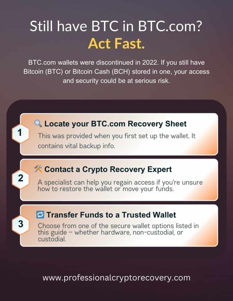 If you still have a BTC.com wallet, it is imperative that you withdraw any assets it may contain to a different address. But what if you’re unable to do that?